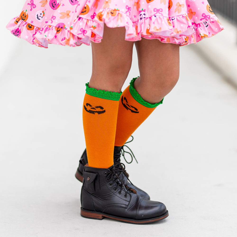 pumpkin inspiried jack o lantern knee high socks for babies, toddlers and girls