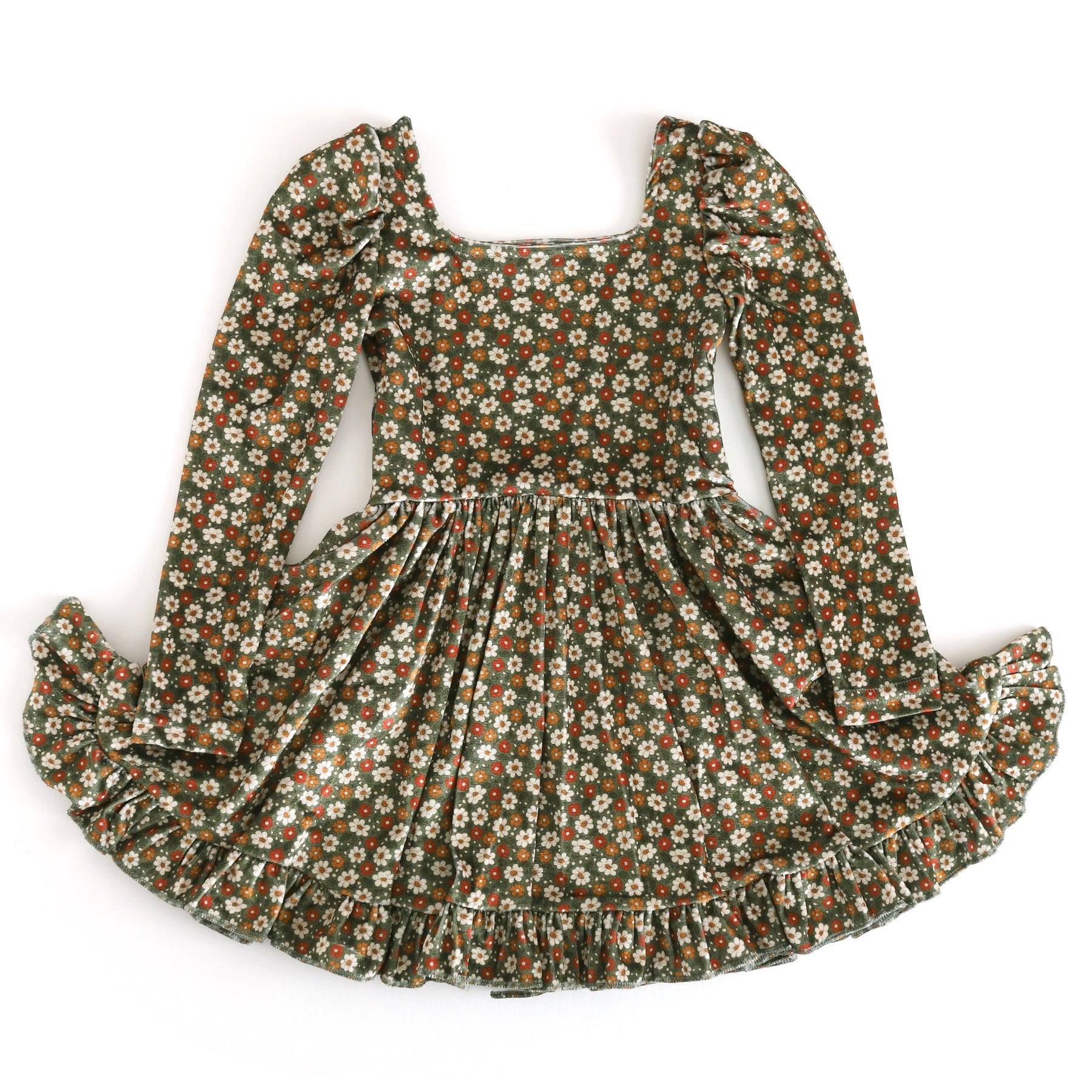 Olive Floral Long Sleeve Velvet Mod Twirl Dress