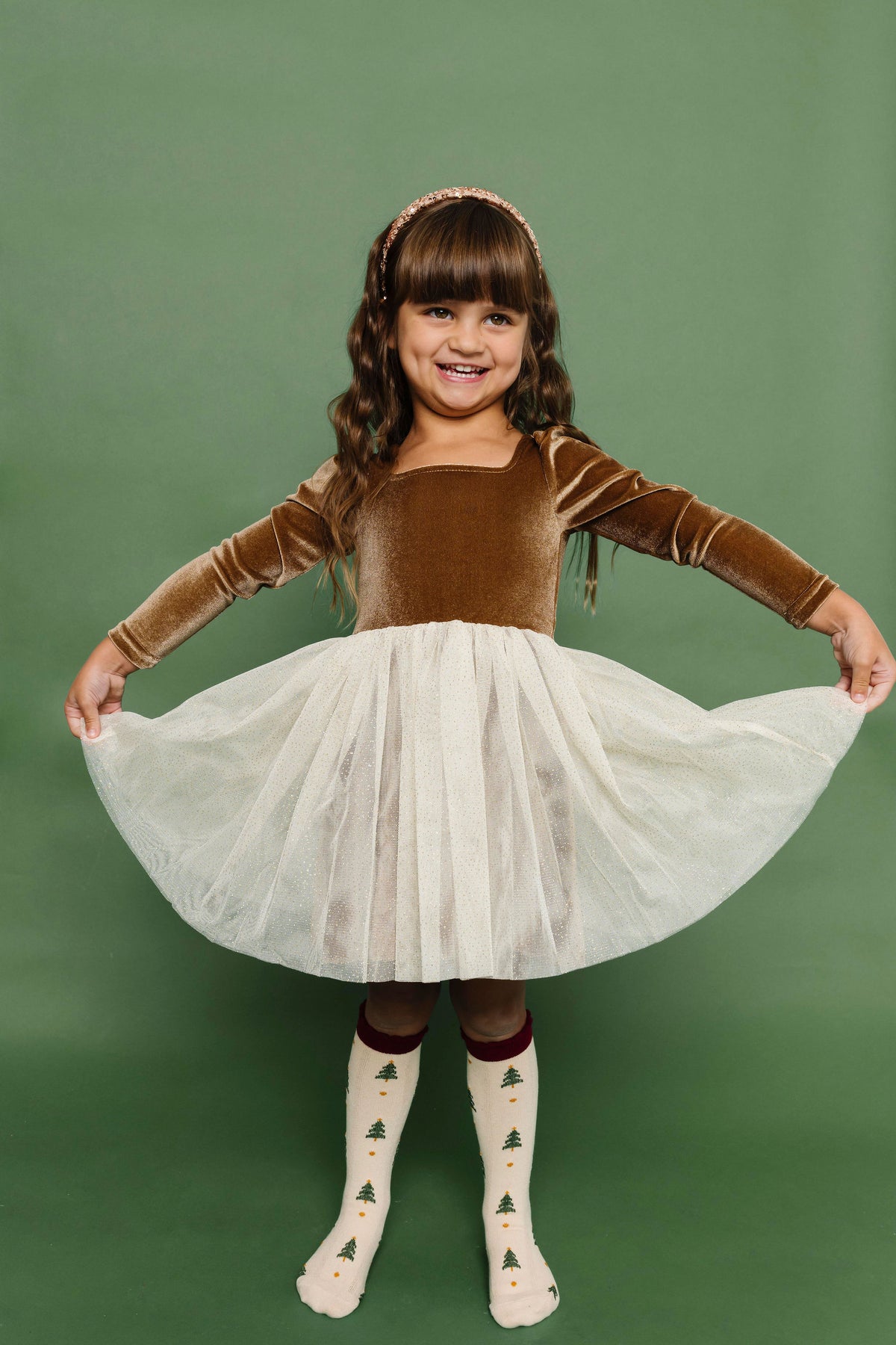 little girl in fancy velvet and tulle Christmas dress in shades of golden brown and cream paired with Christmas tree print knee socks and gold sparkle headband