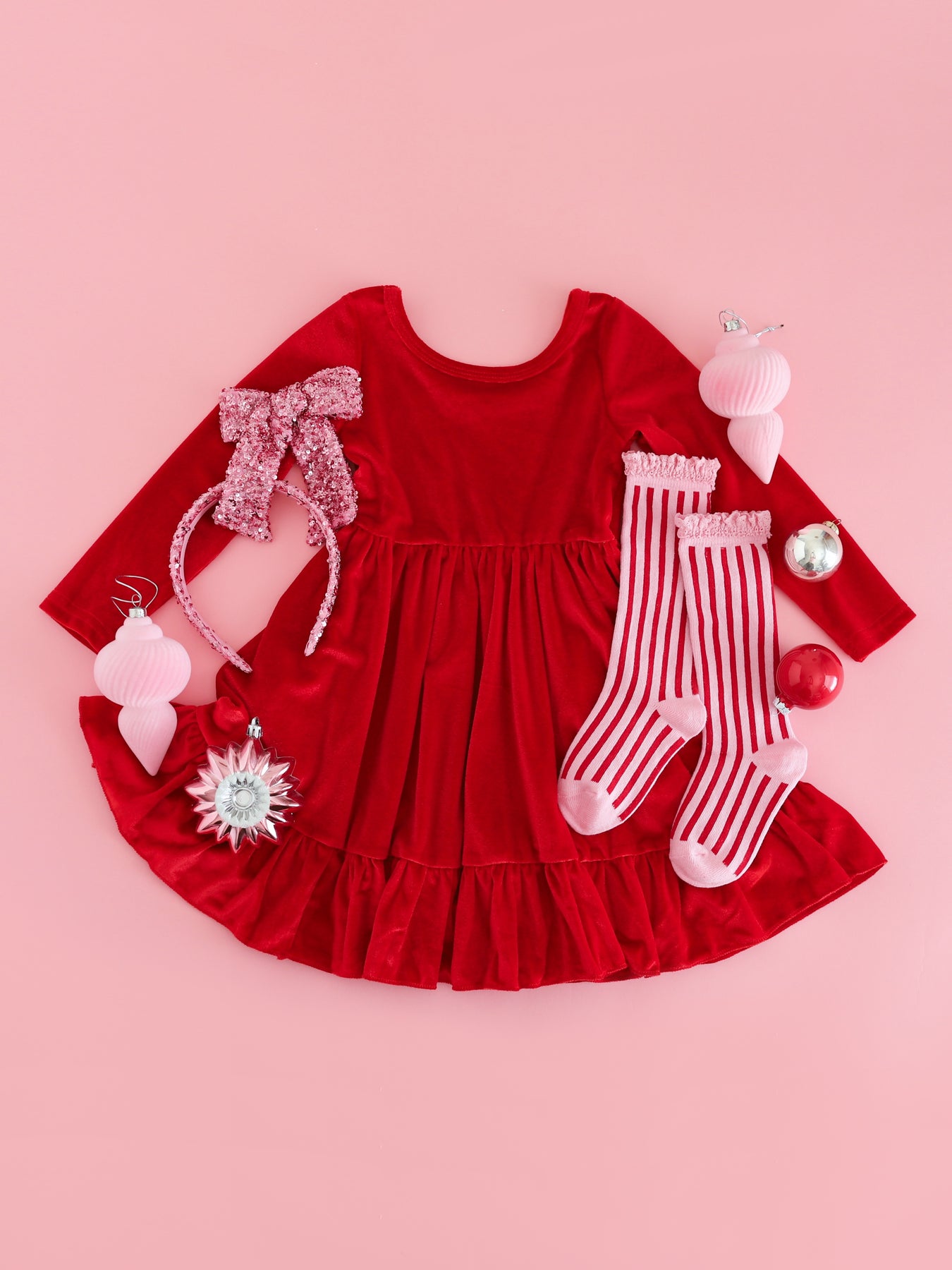 girls' red velvet long sleeve twirl dress with sparkly pink hair accessories and red and pink striped knee socks for Christmas