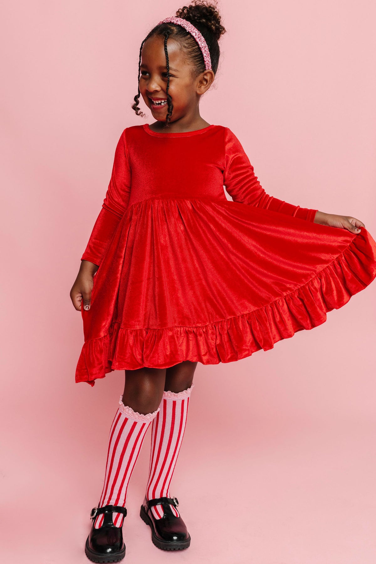 little girl twirling in bright red velvet long sleeve dress, pink sparkly headband and pink knee socks with vertical red stripe design for Christmas