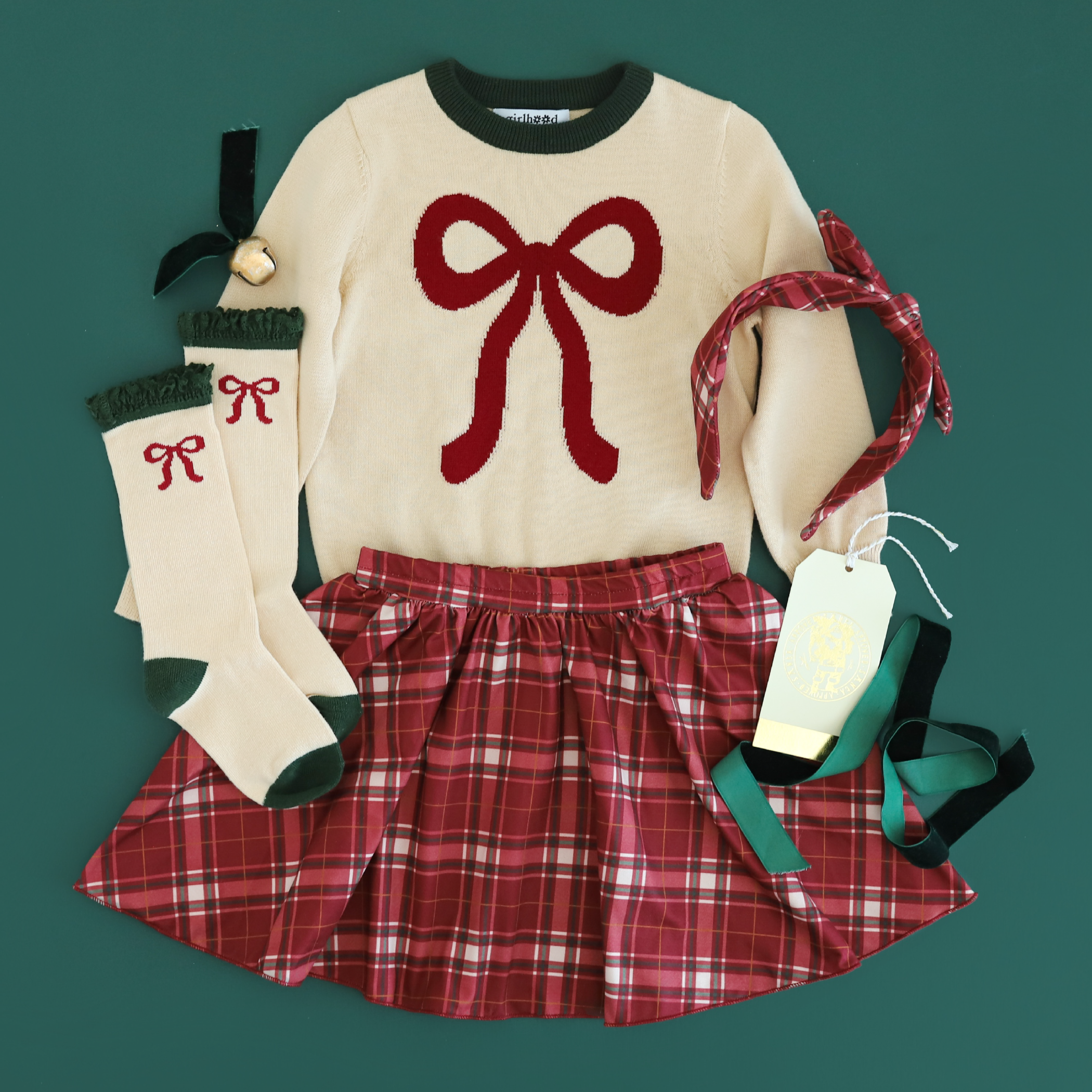girls' Christmas outfit featuring forest green plaid twirl dress, cream knit sweater with crimson bow design and matching bow socks