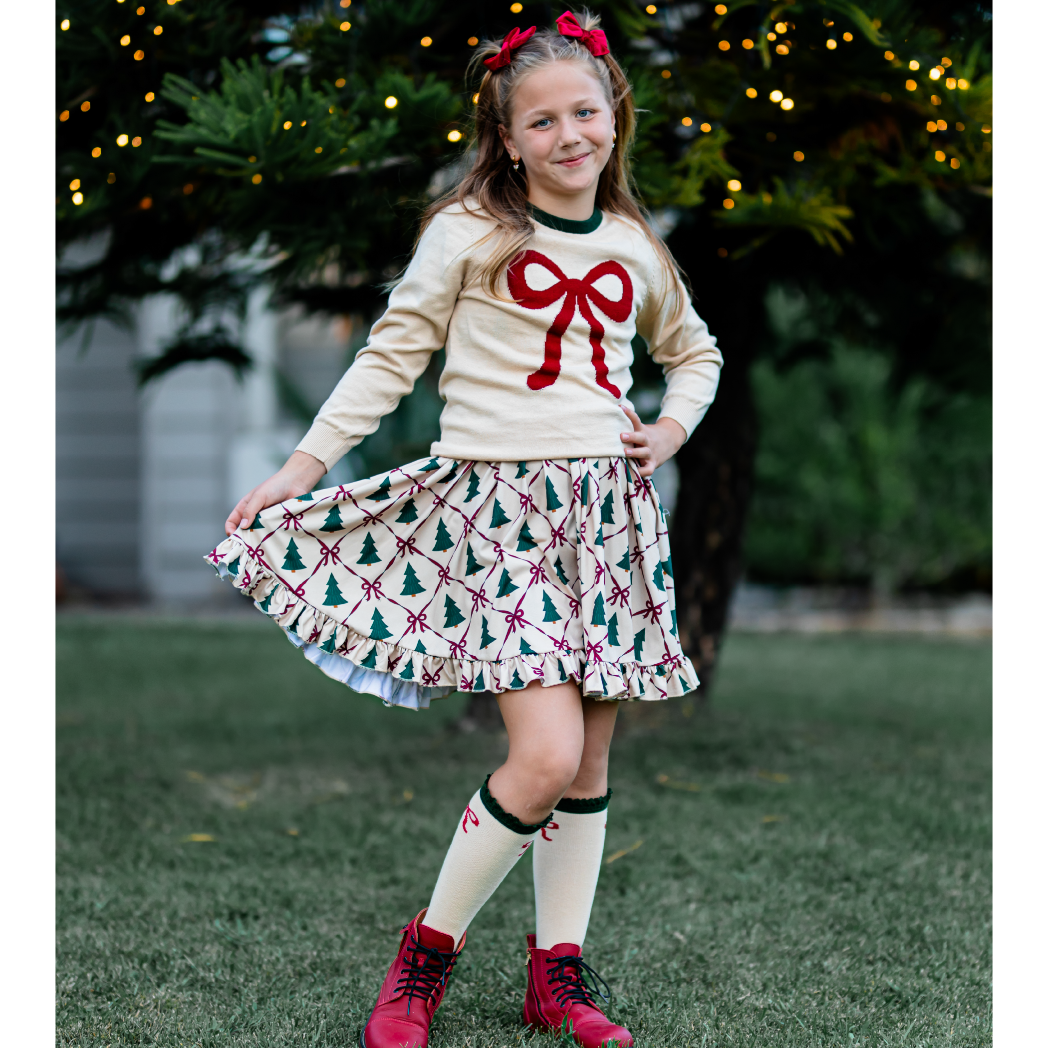 little girl in crimson and cream bow sweater, tutu skort, satin pigtail bows and matching bow knee socks for Christmas