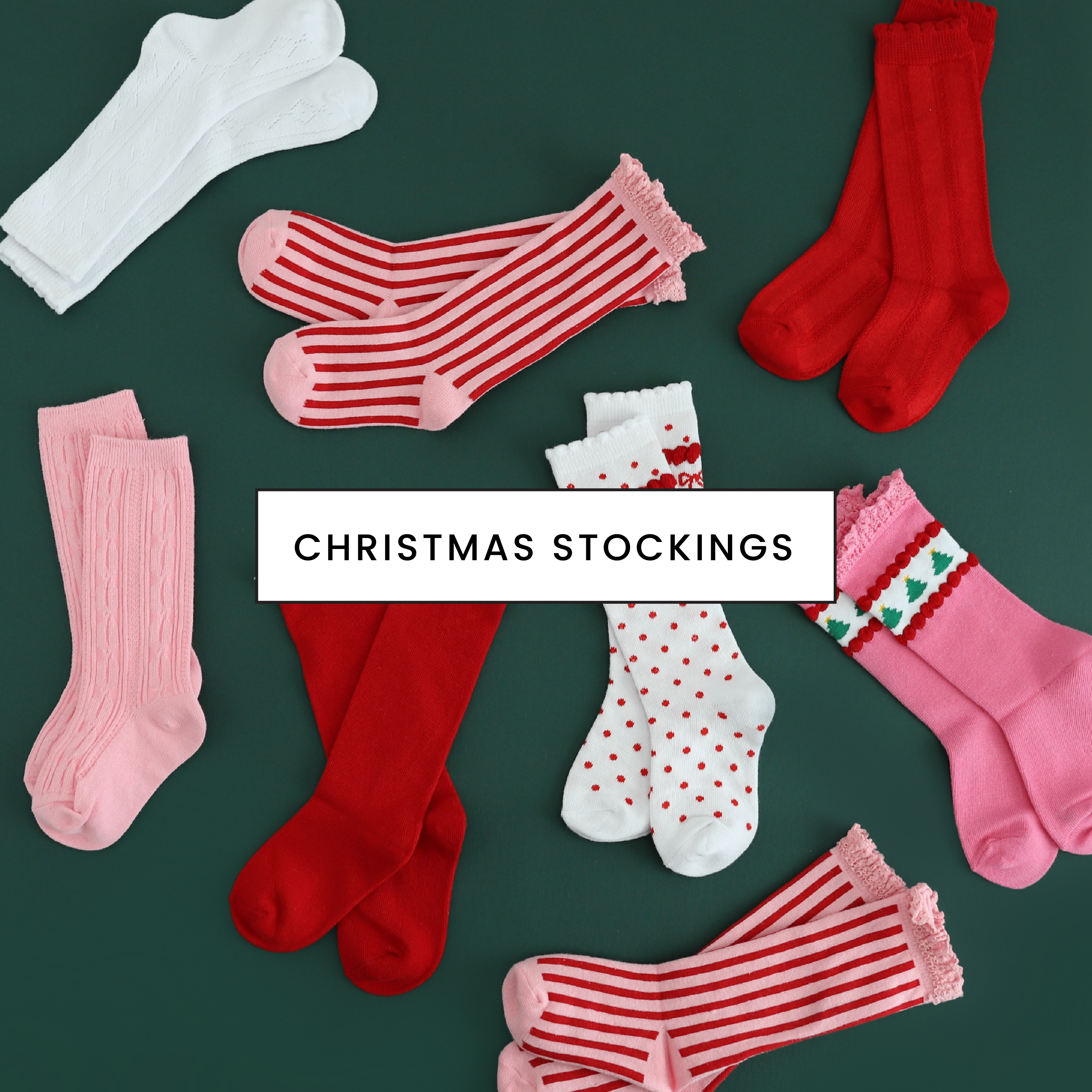 girls crimson bow themed Christmas mix and match featuring Christmas tree dress with crimson ribbon detail and matching sweaters, socks and bows