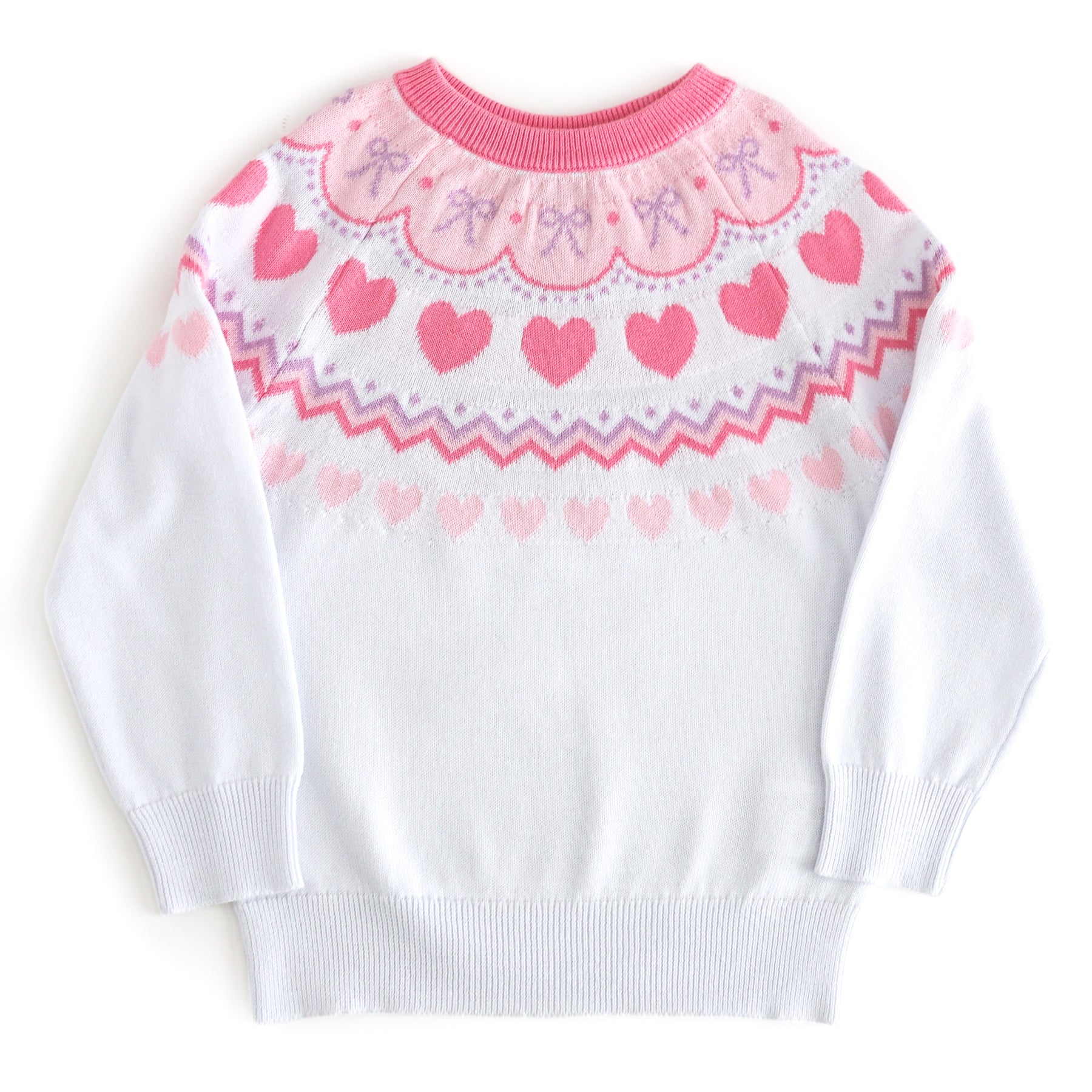 girls white knit pullover sweater with pink and purple heart and bow fair isle pattern for Valentine's Day