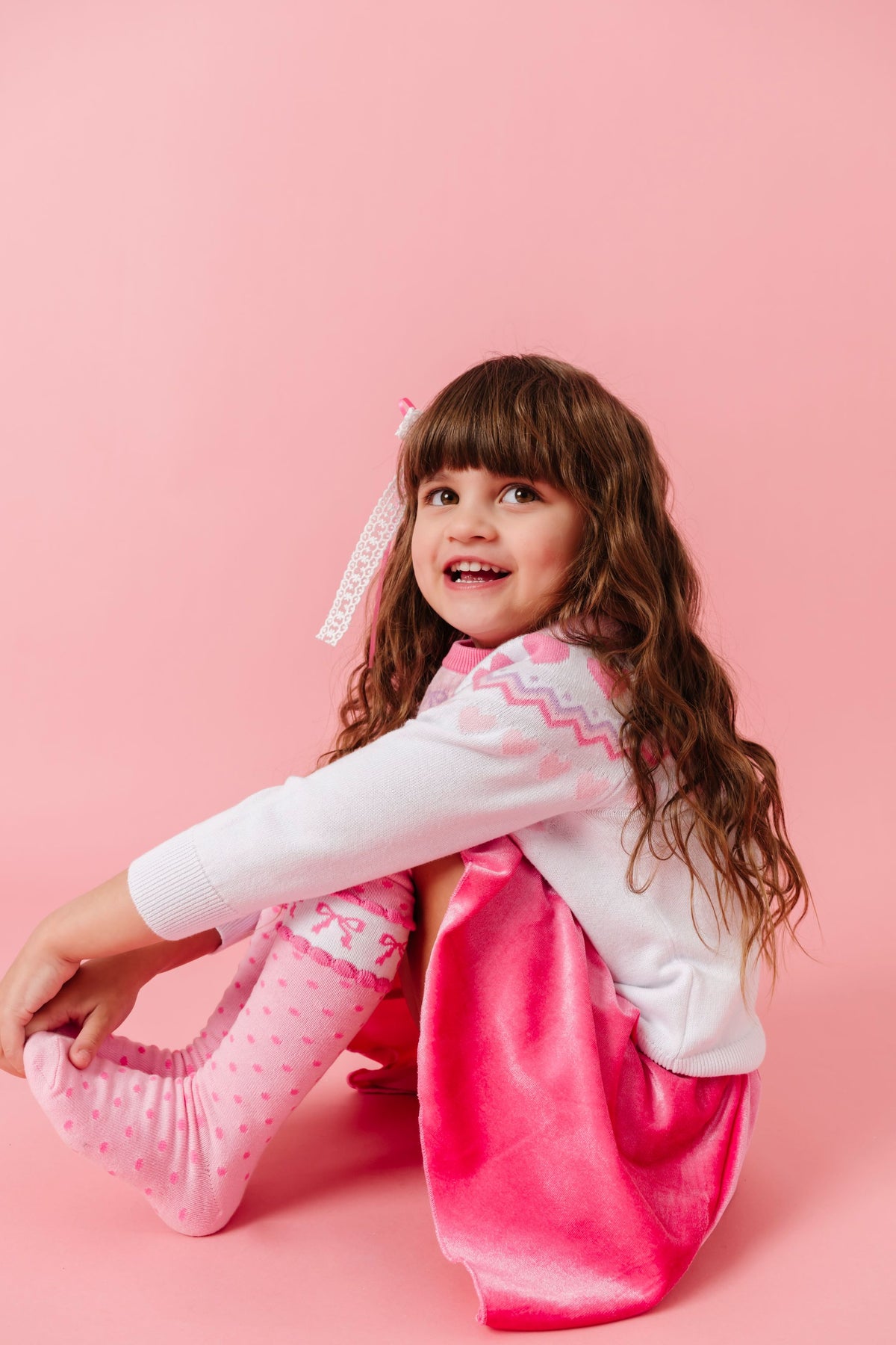 little girl sitting in valentines fair isle sweater, pink velvet skort and matching pink bow knee socks