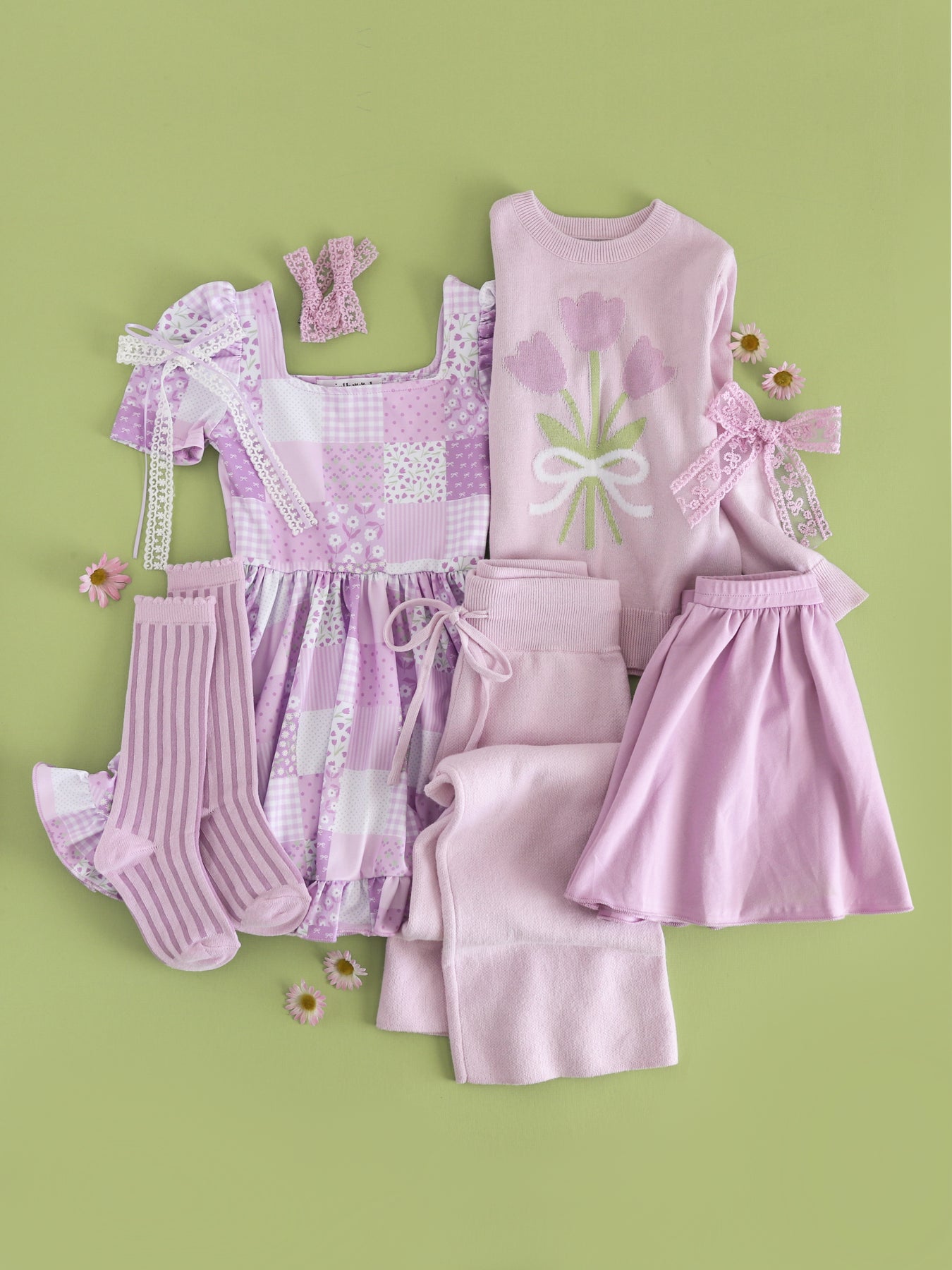 girls' dress, skort, knitwear and accessories in shades of pastel purple for spring