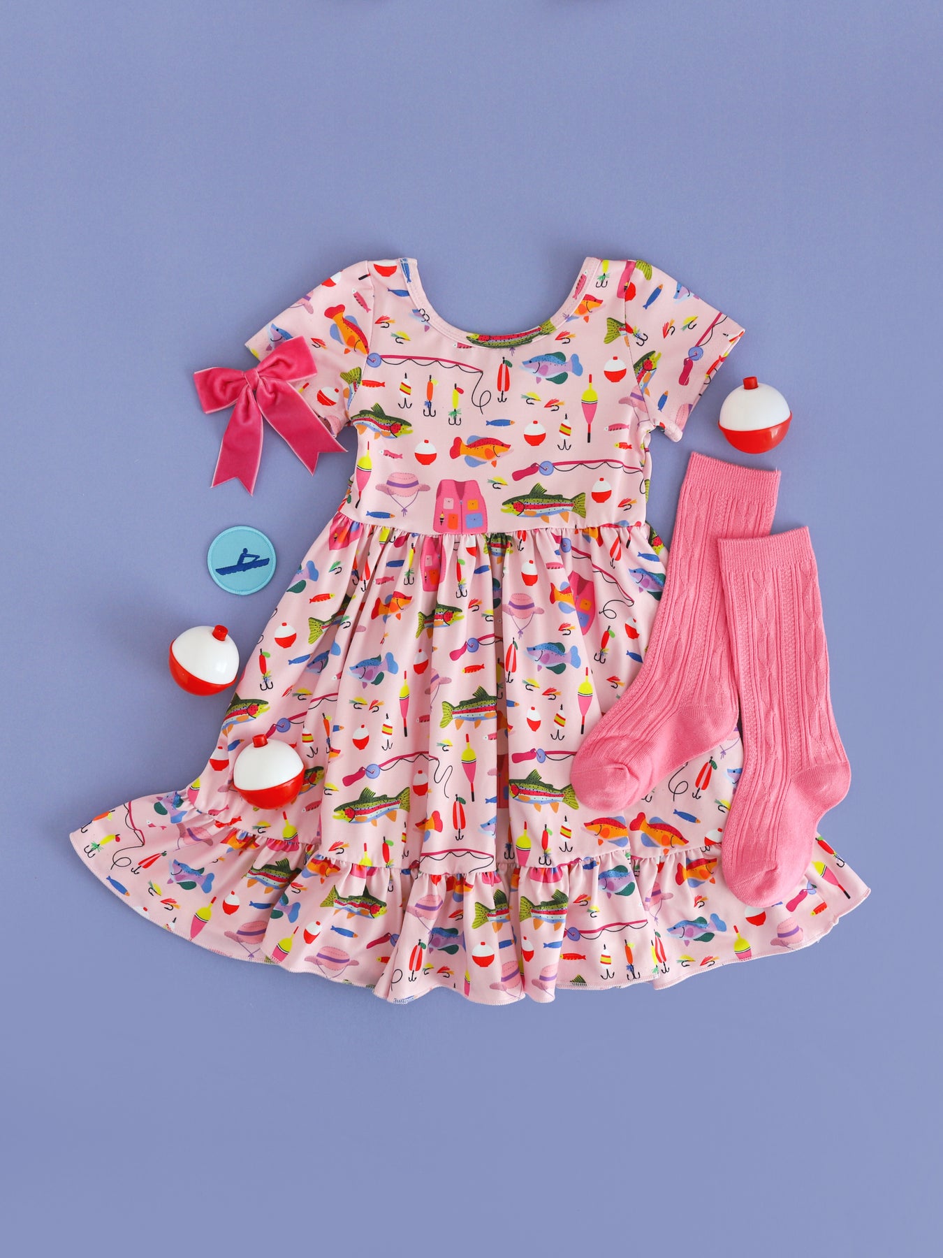 styled photo for girls' pink fishing themed twirl dress with matching pink knee high socks and velvet pink ribbon bow on clip
