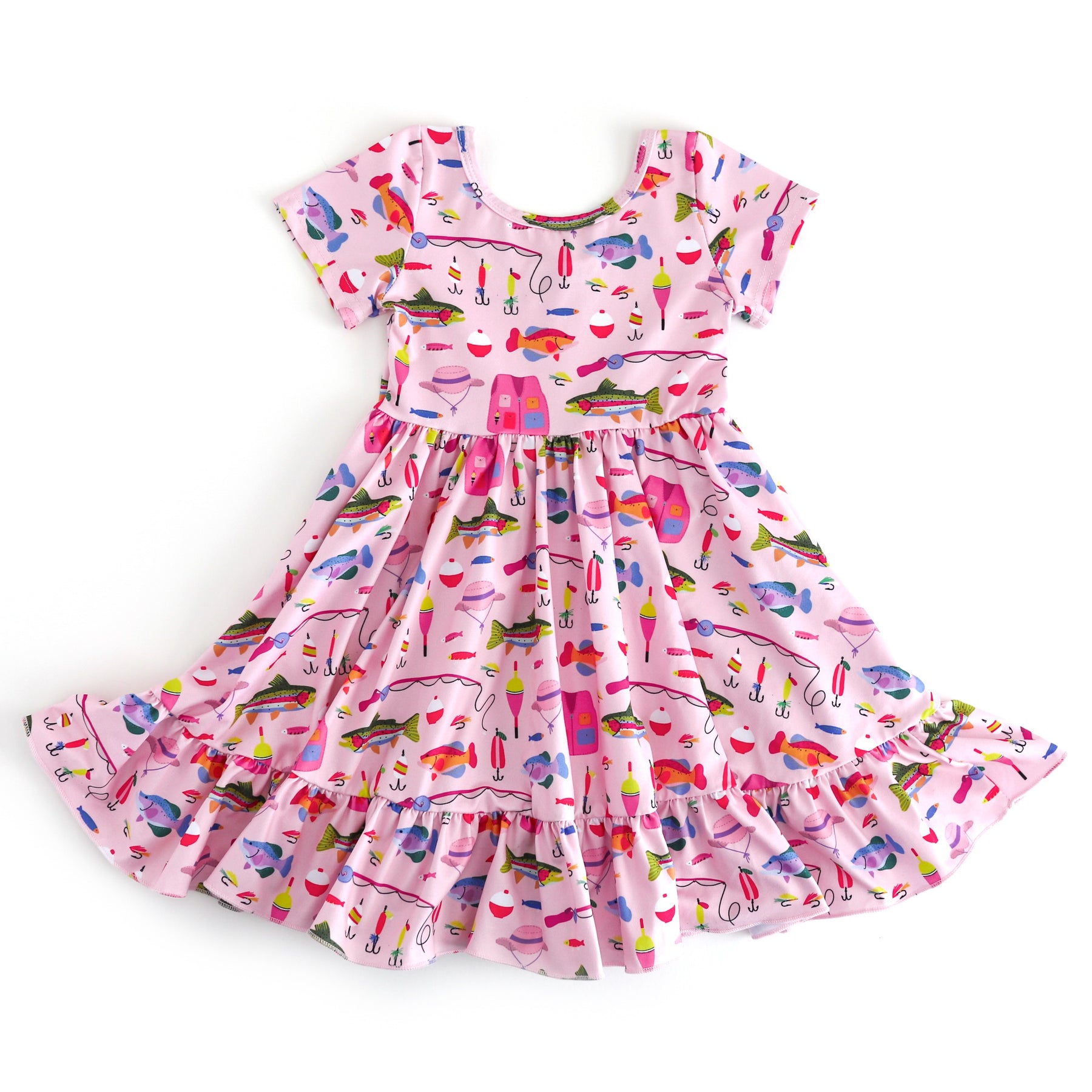 girls pink short sleeve twirl dress with ruffle hem and colorful fishing print