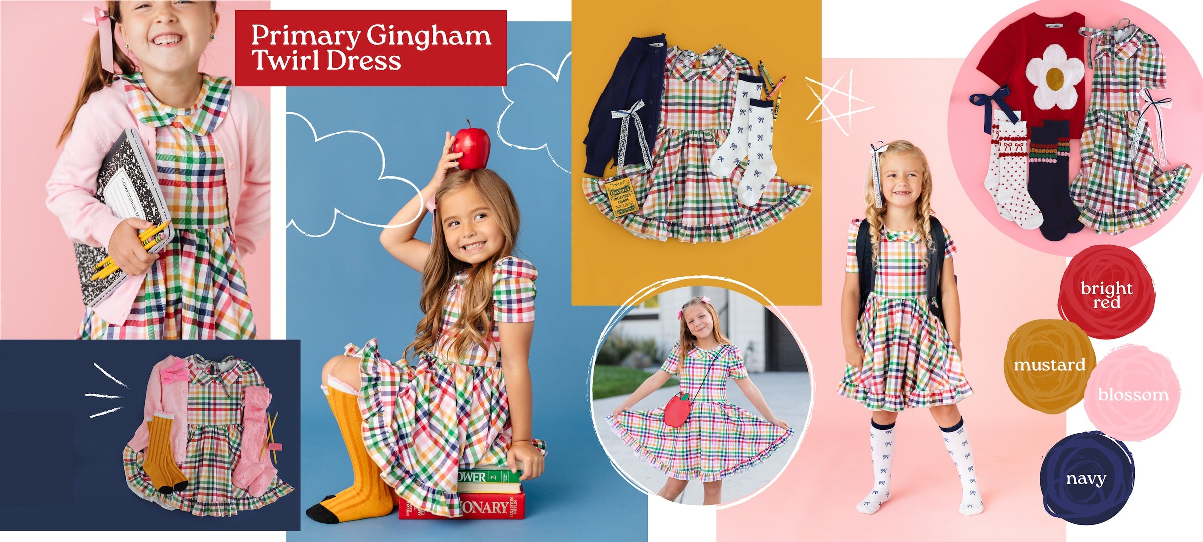 We make styling your girls easy! Our custom Primary Gingham is sure to be her newest favorite! Combine it with custom selected accessories in coordinating colors and the mix-and-match magic is endless. Scroll for some of our favorite pairings!