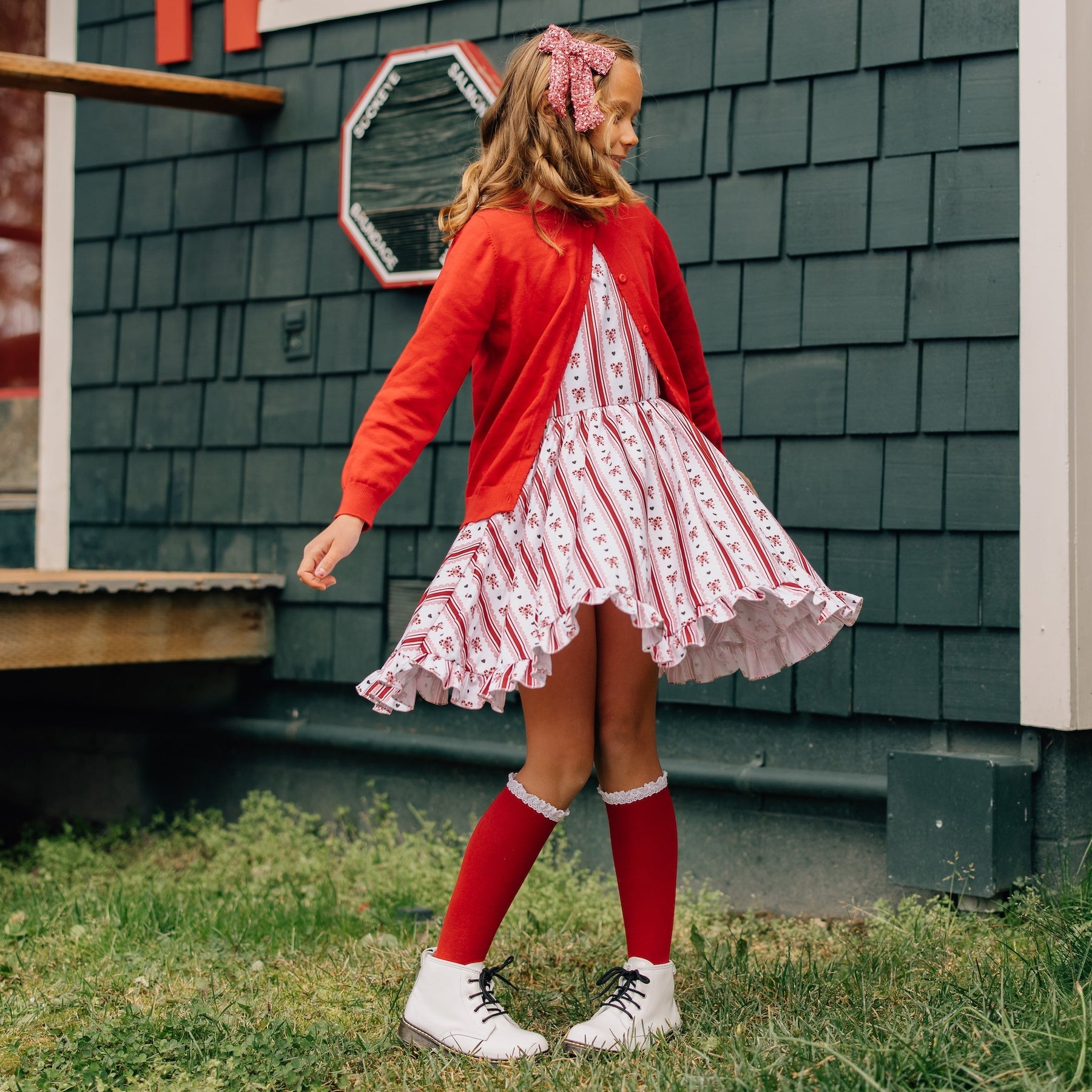 little girl in white Christmas twirl dress with vintage candy cane print in red, pink and green paired with bright red cardigan and matching socks and bow