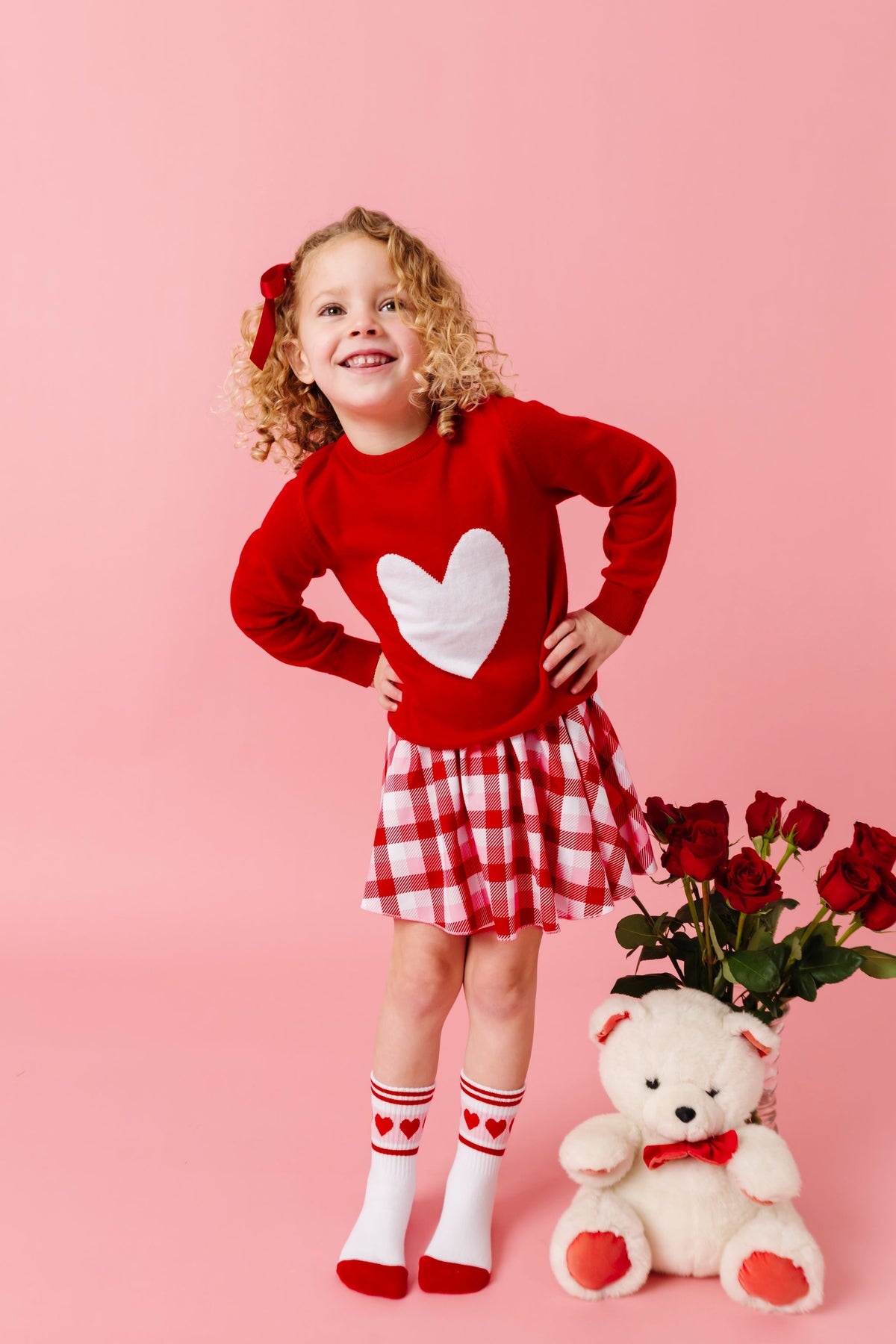 young girl standing by stuffed bear and red roses wearing bright red heart sweater paired with red and pink plaid skort and valentines themed crew socks