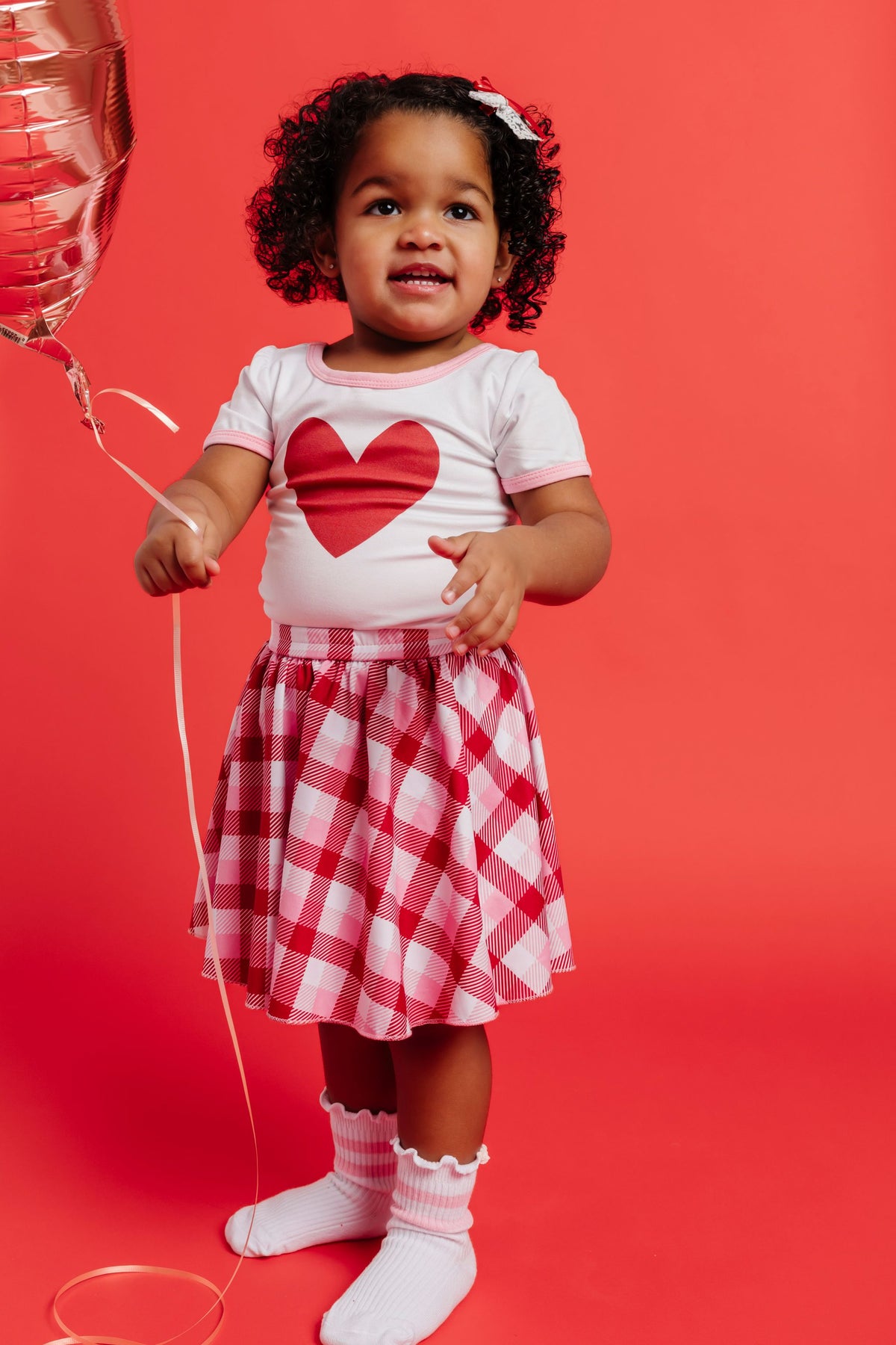 little girl holding heart balloon in white bamboo top with red heart and plaid valentines skort with ribbed white midi socks