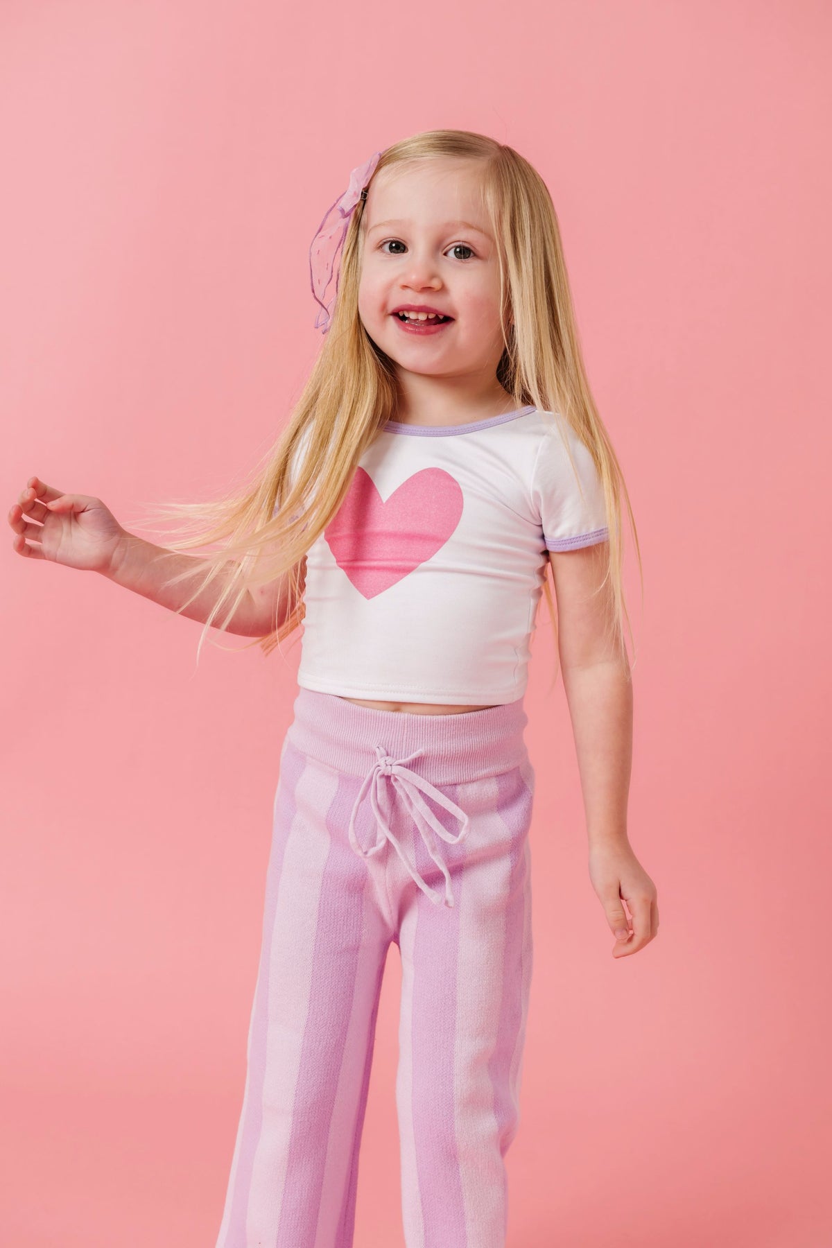 girl in white fitted top with pink heart paired with two tone pastel purple sweater pants for valentines day
