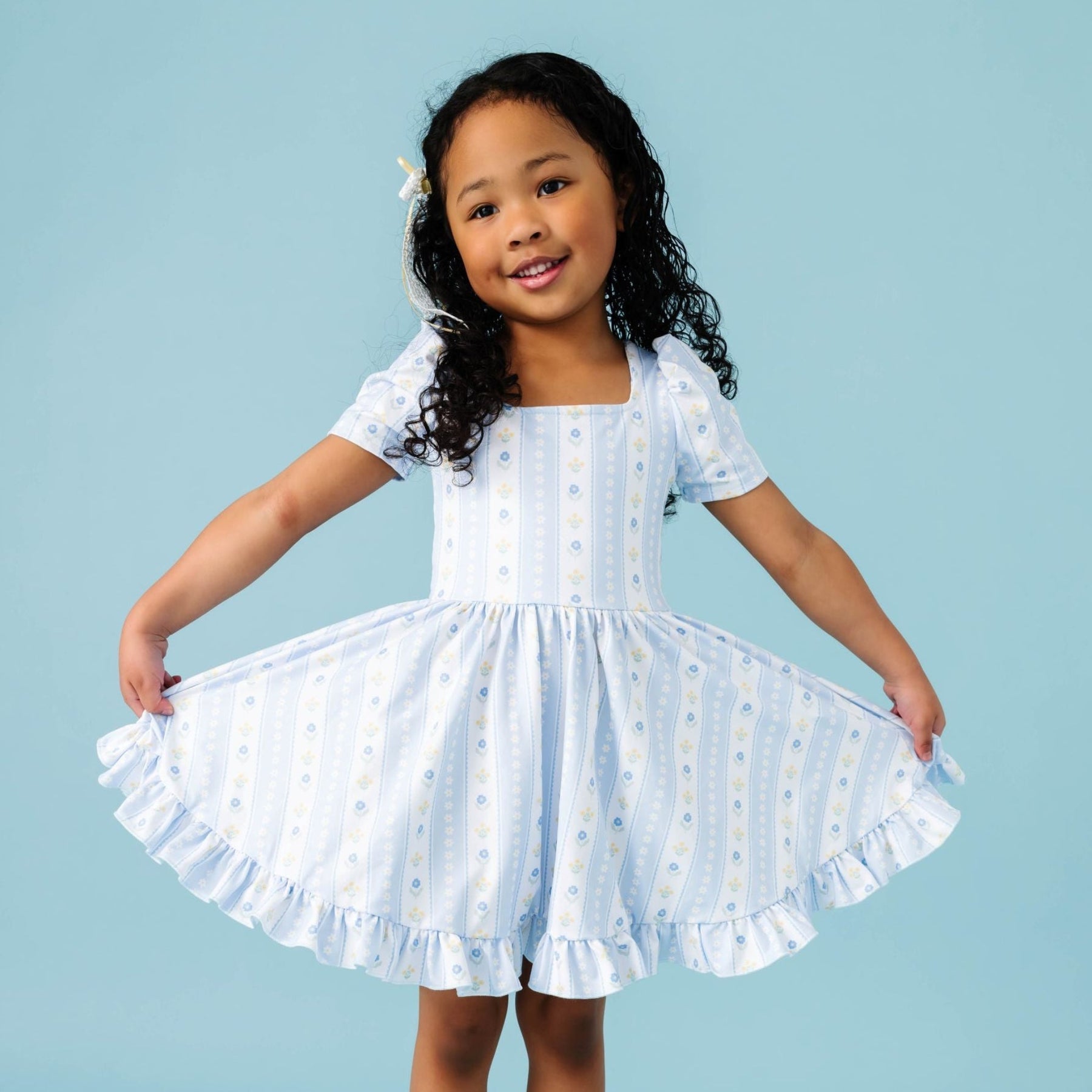 My granddaughter wears a 4T, but we sized up to a size 5 in this dress. We could barely get her arms into the sleeves, the midsection is too tight, and the neck gapes so is not modest.