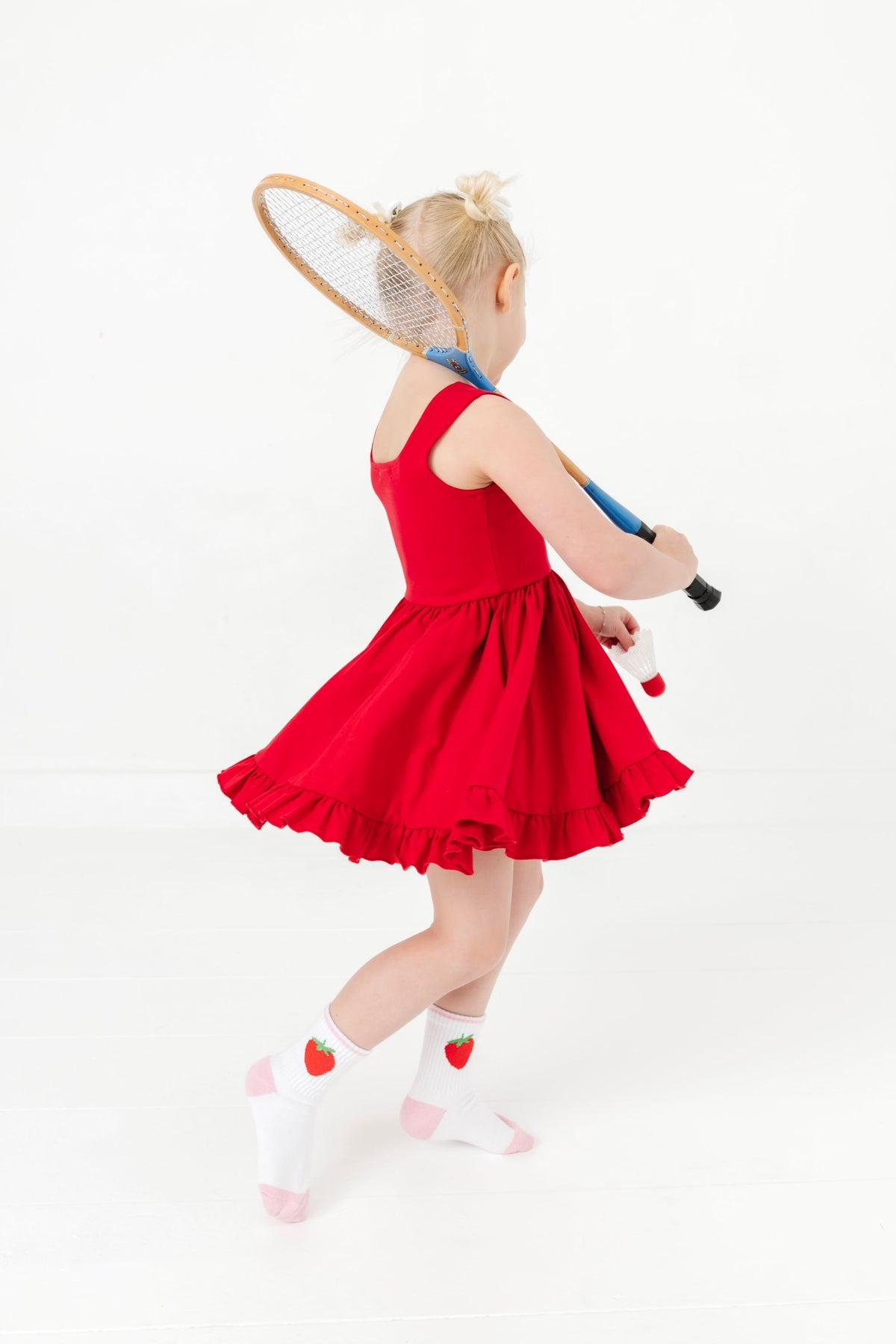 little girl twirling with racket in bright red sleeveless twirl dress paired with strawberry print crew socks