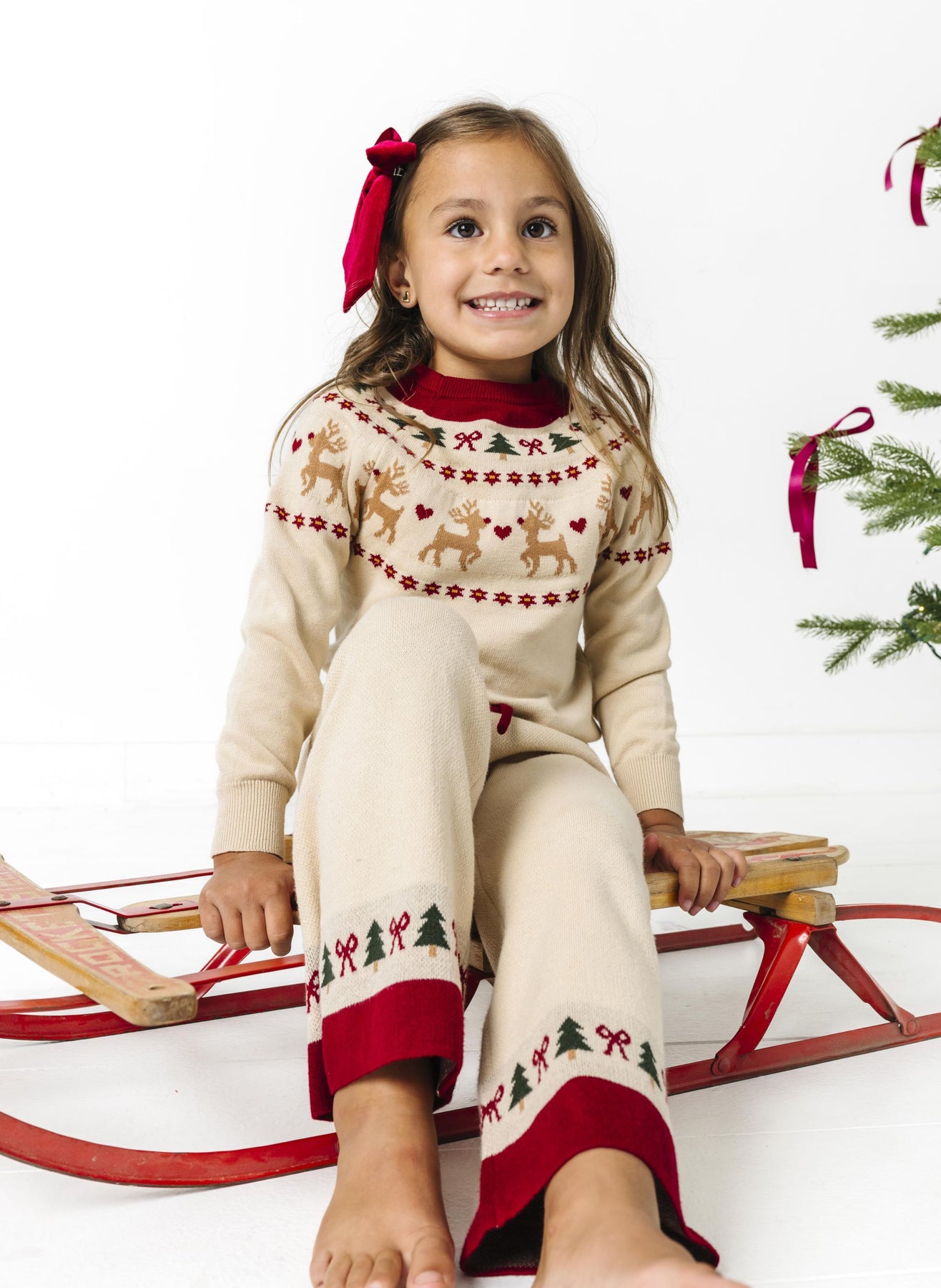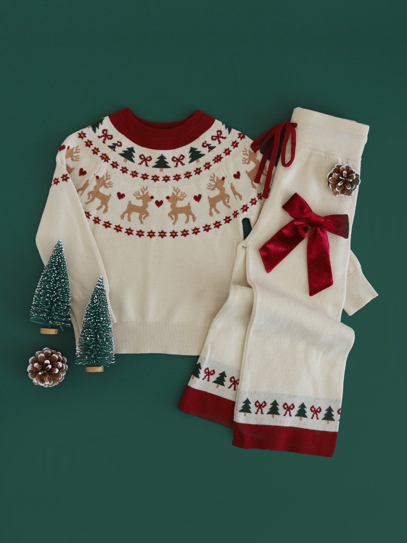 girls' cream knit pullover sweater with fair isle reindeer, tree and bow print paired with matching cream knit sweater pants with bow and tree print at the ankle