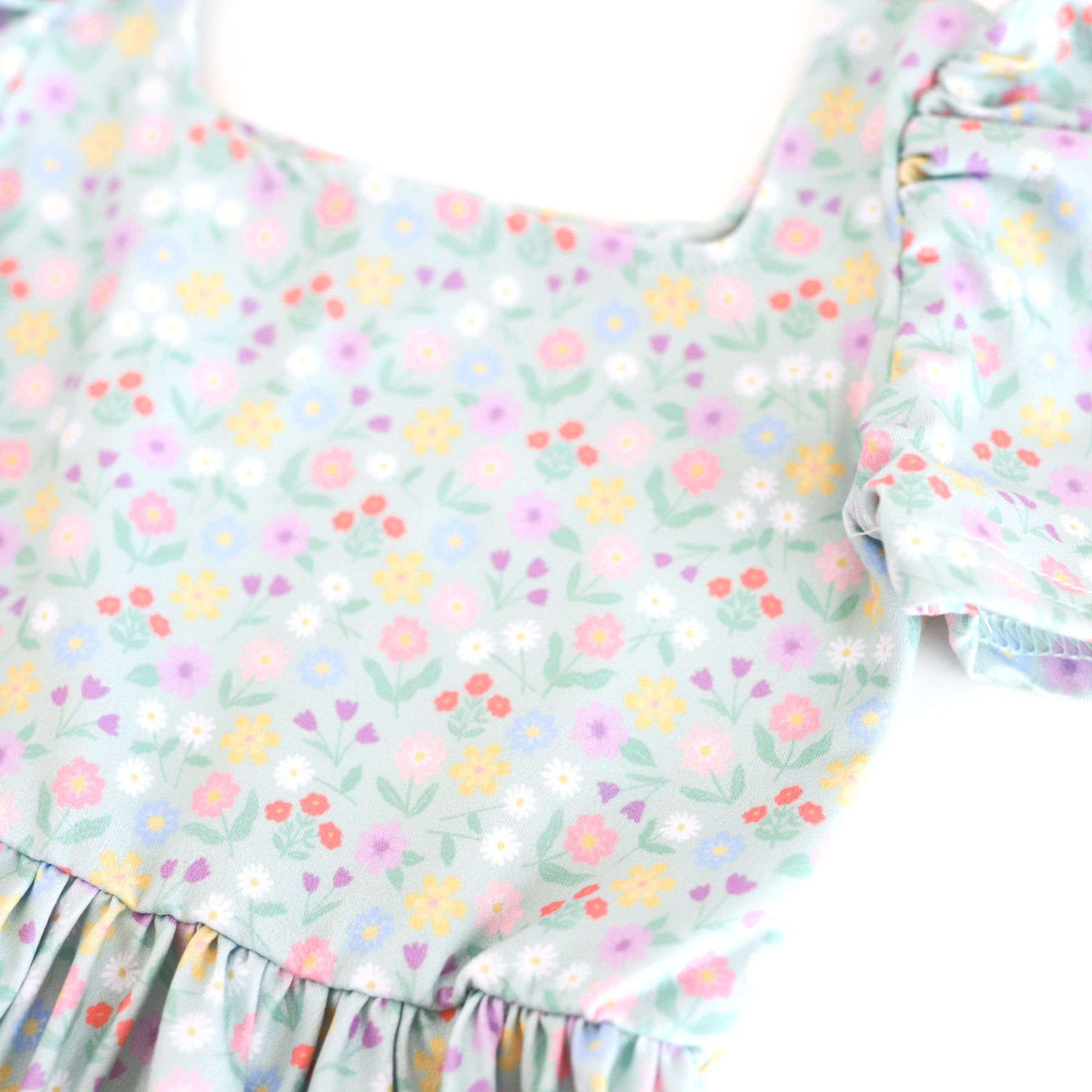 closeup of spring floral twirl dress print with soft mint background and pastel flowers