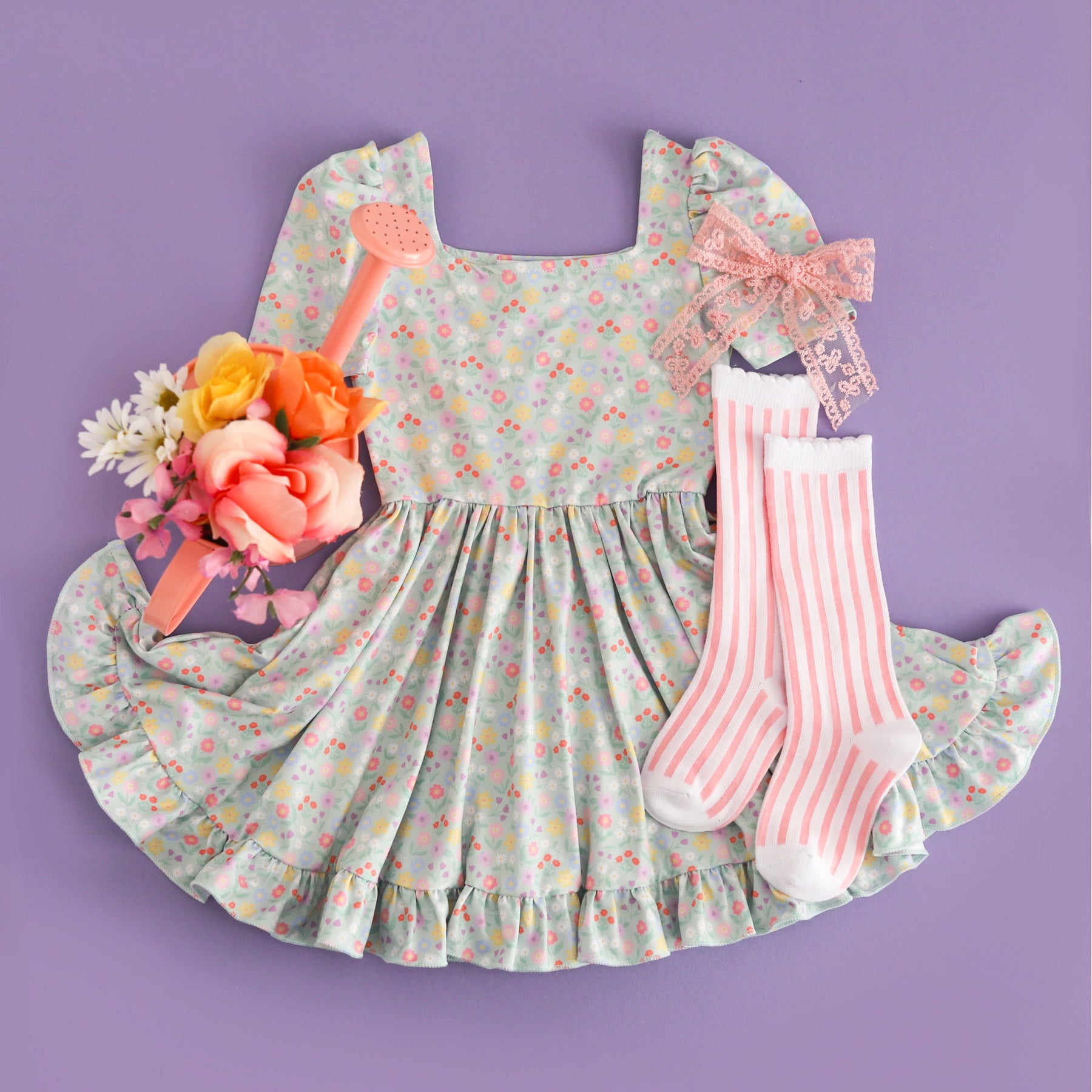 spring flat lay for girls' soft mint twirl dress with petite pastel spring floral print styled with white and light pink vertical striped knee socks, pink lace hair bow and watering can filled with flowers