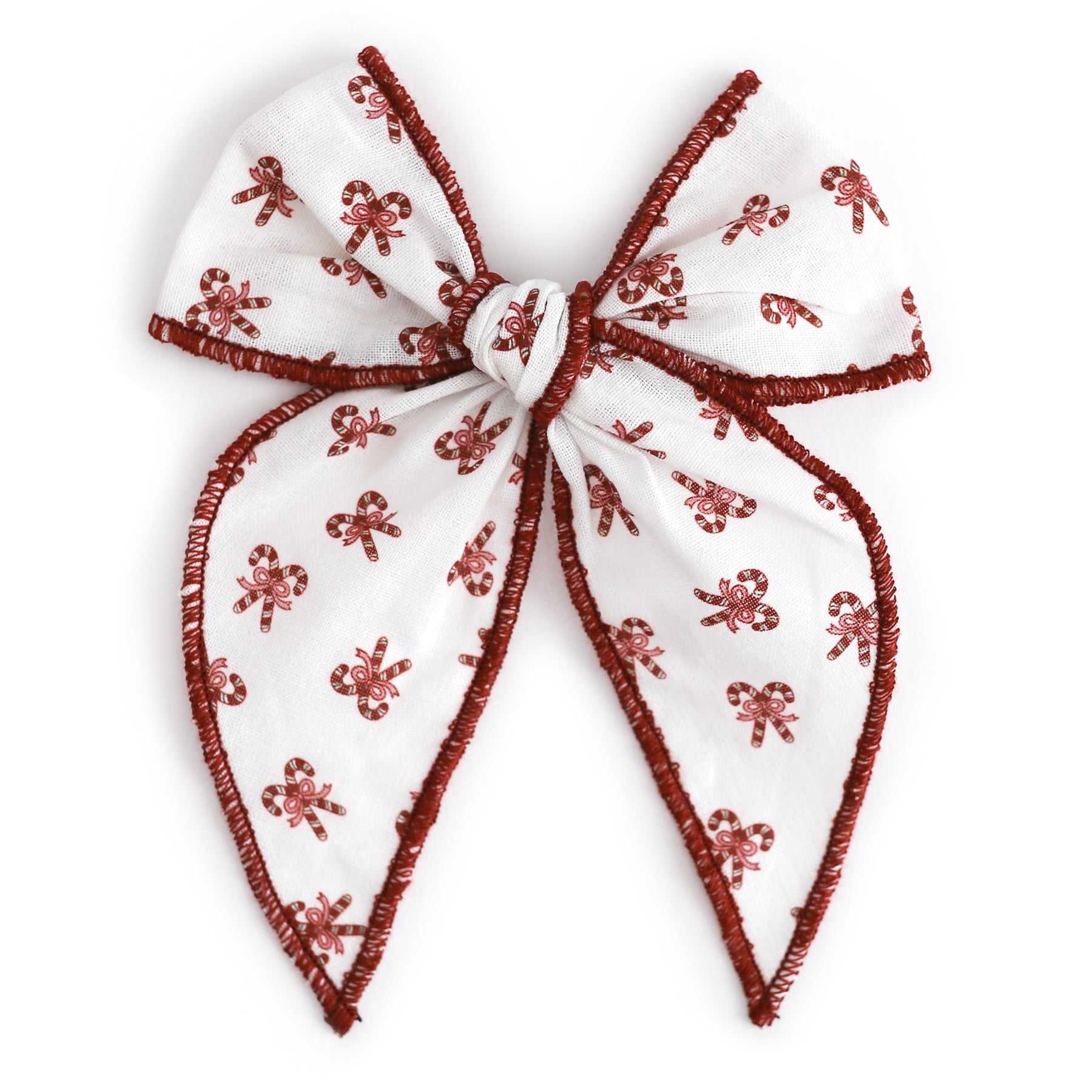 Candy Cane print hair bow attached to stainless steel alligator clip.