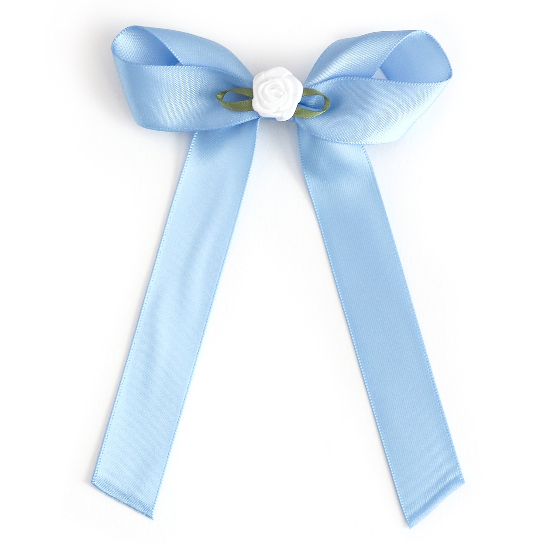 Rosette Satin Ribbon Bows are approximately 4" wide and 5"-6" long. Bows are attached to a silver alligator clip.