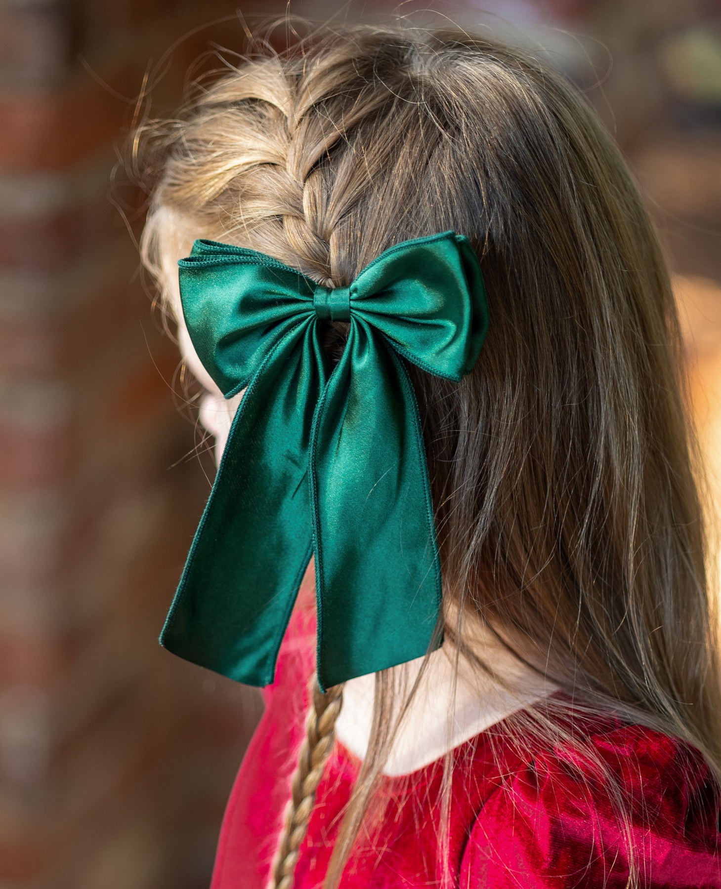 young girl in deep green satin double bow on clip paired with gold velvet Christmas dress
